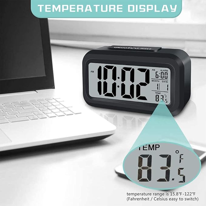 • Multi-function: alarm clock digital large lcd display, smart backlight can keep on automatically, you can see the time clearly in the night. Includes month date alarm setting and indoor temperature