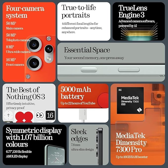 Presenting wide range of collection of CMF Phone 2 Pro from the house of Nothing. CMF Phone 2 pro comes with 8GB RAM, 128GB RAM & 17.02 cm (6.77inch) Display Flexible AMOLED Display. Smartphones are powered by a Snapdragon chipset 6s Gen 7300 pro Processor. With Android 15 Operating System. offering 2X the distance with Optical Zoom, or use advanced Hybrid Zoom for 30X the distance. Either way, Optical Image Stabilization smoothens out unwanted shakes 50MP + 13MP + 16MP, a 50MP Front Camera. Also, it has a 5000 MAh powerful battery, Turbo Power Charging + 33 W Wireless Charging + 10 W Reverse Charge. fast charge can quickly restore full power, so you can use the phone for hours on end